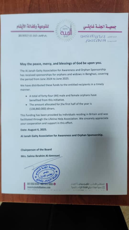 * Provided **7,025 Libyan Dinars** for essential medication to a hospital in southern Libya.